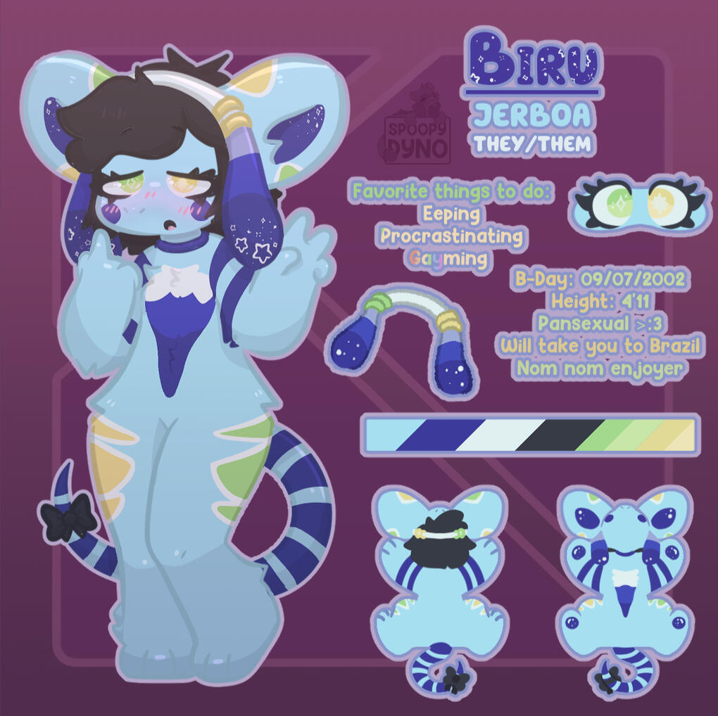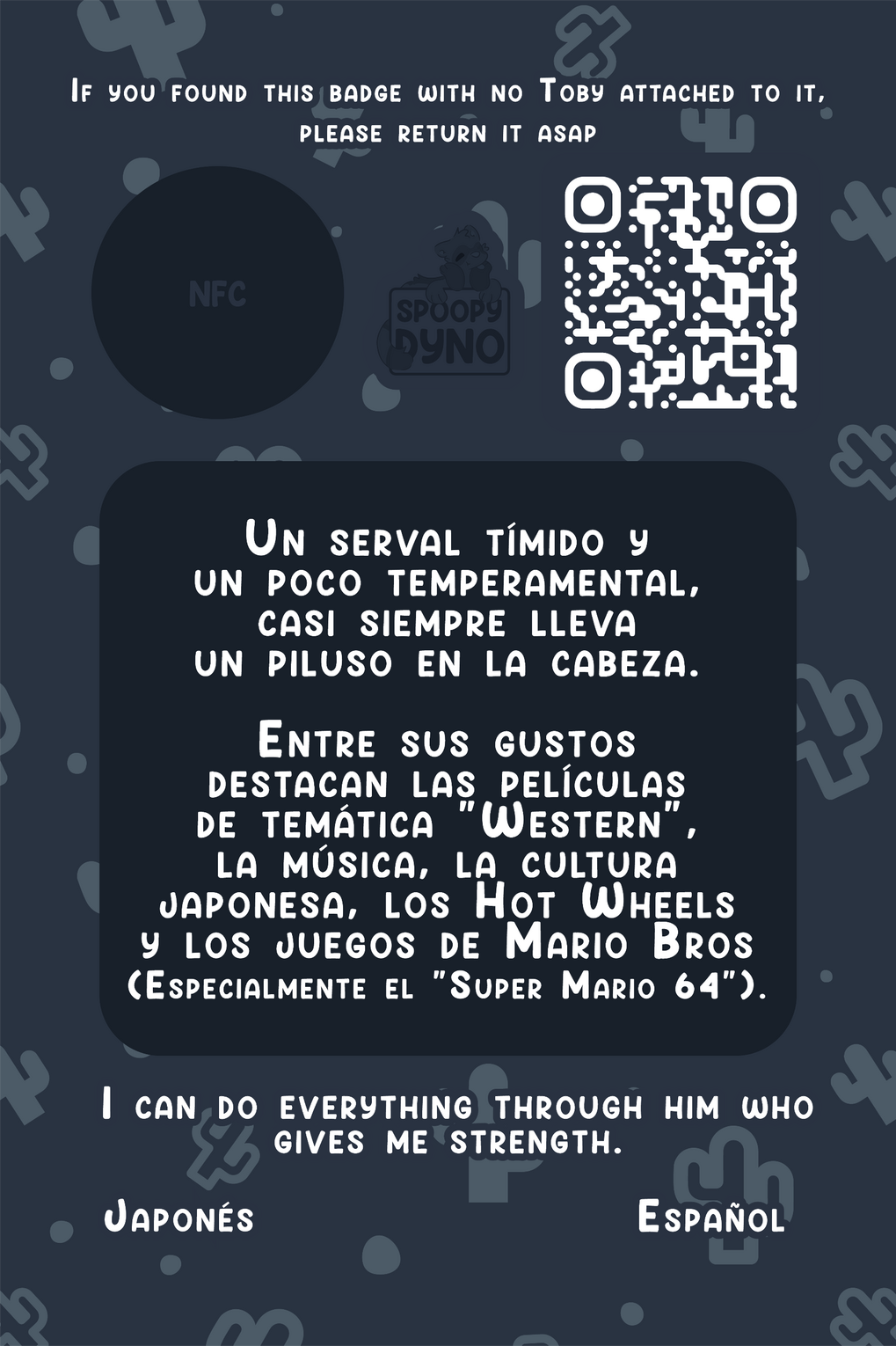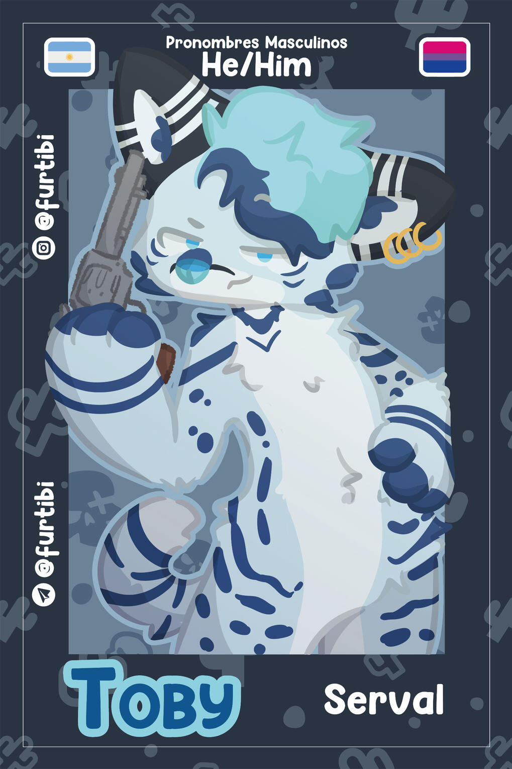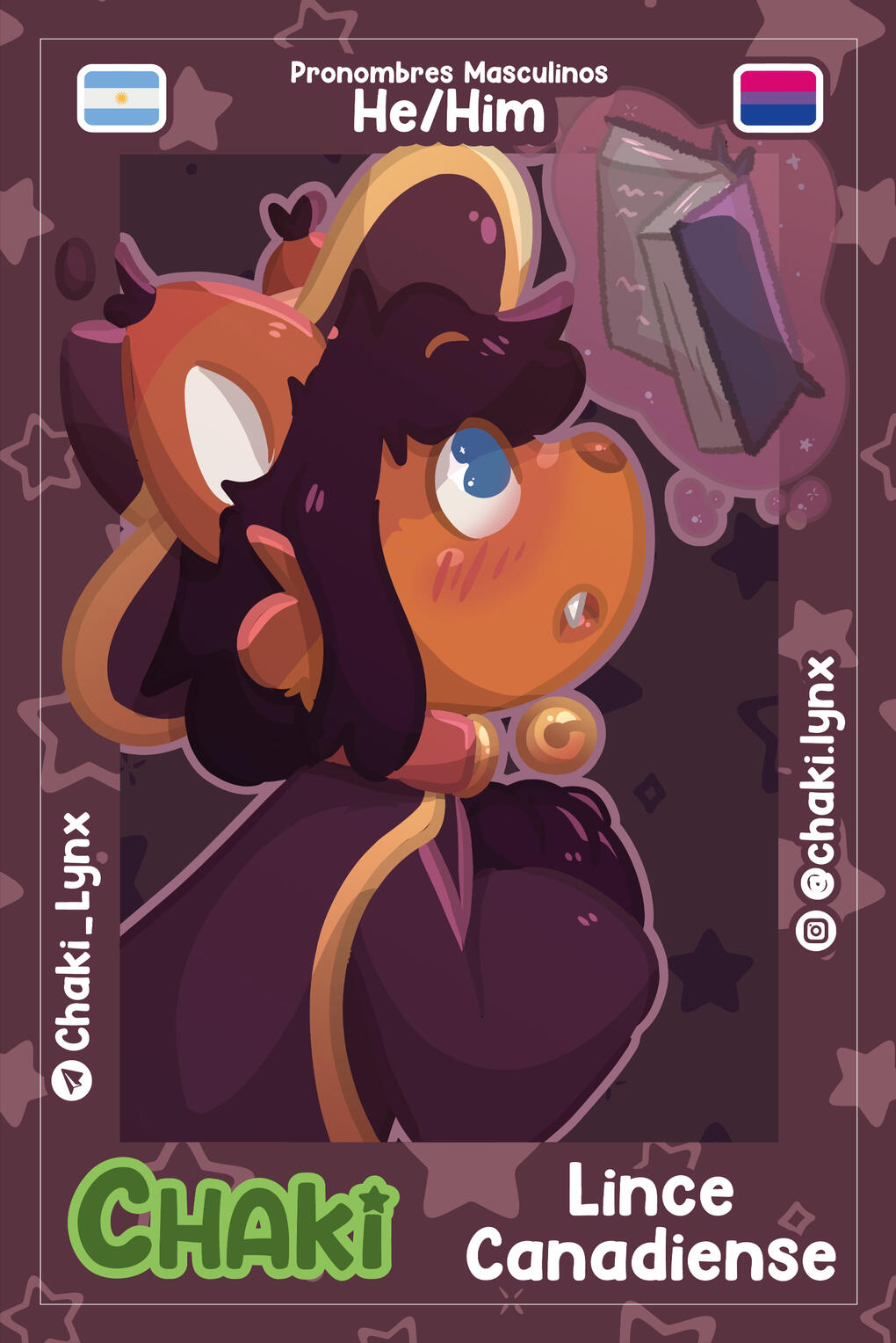La parte delantera tiene el nombre del personaje, su especie, sus pronombres, dos banderas, dos redes sociales, y un Half o Fullbody.