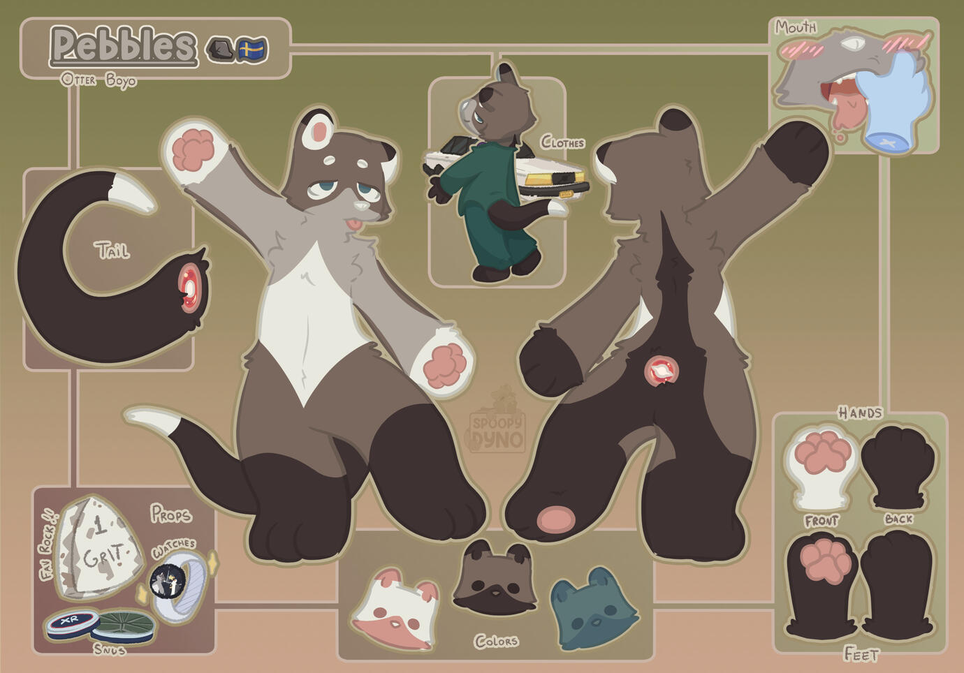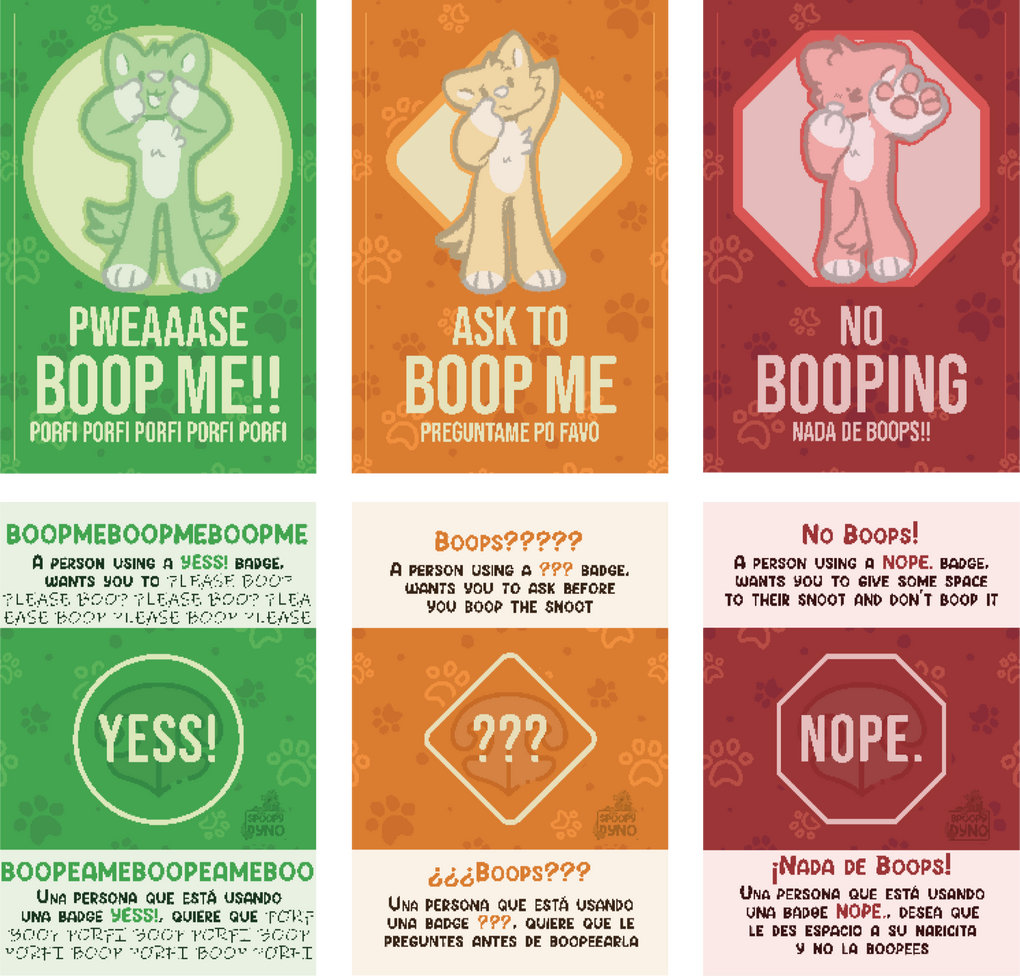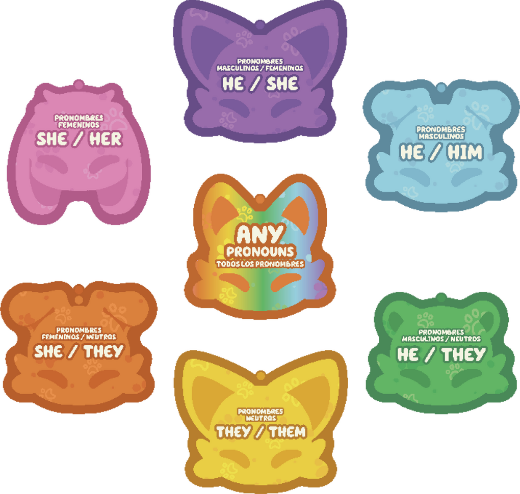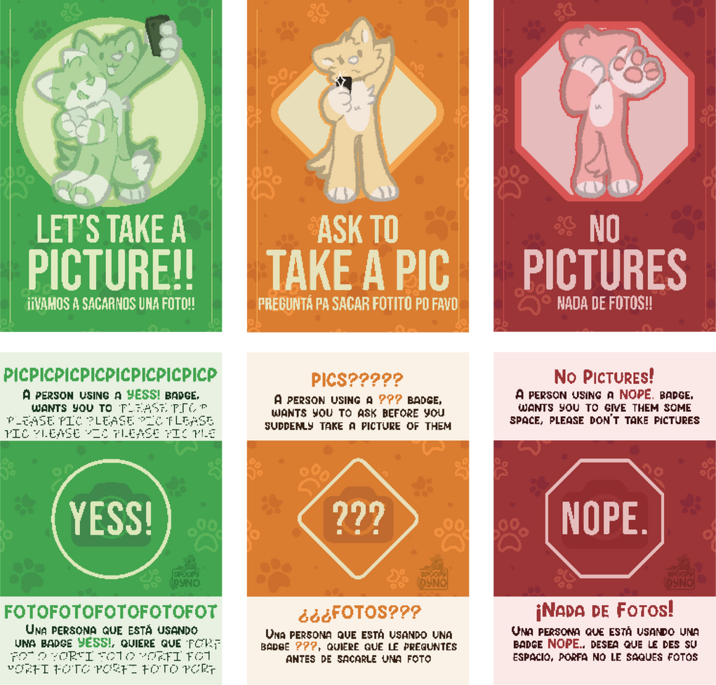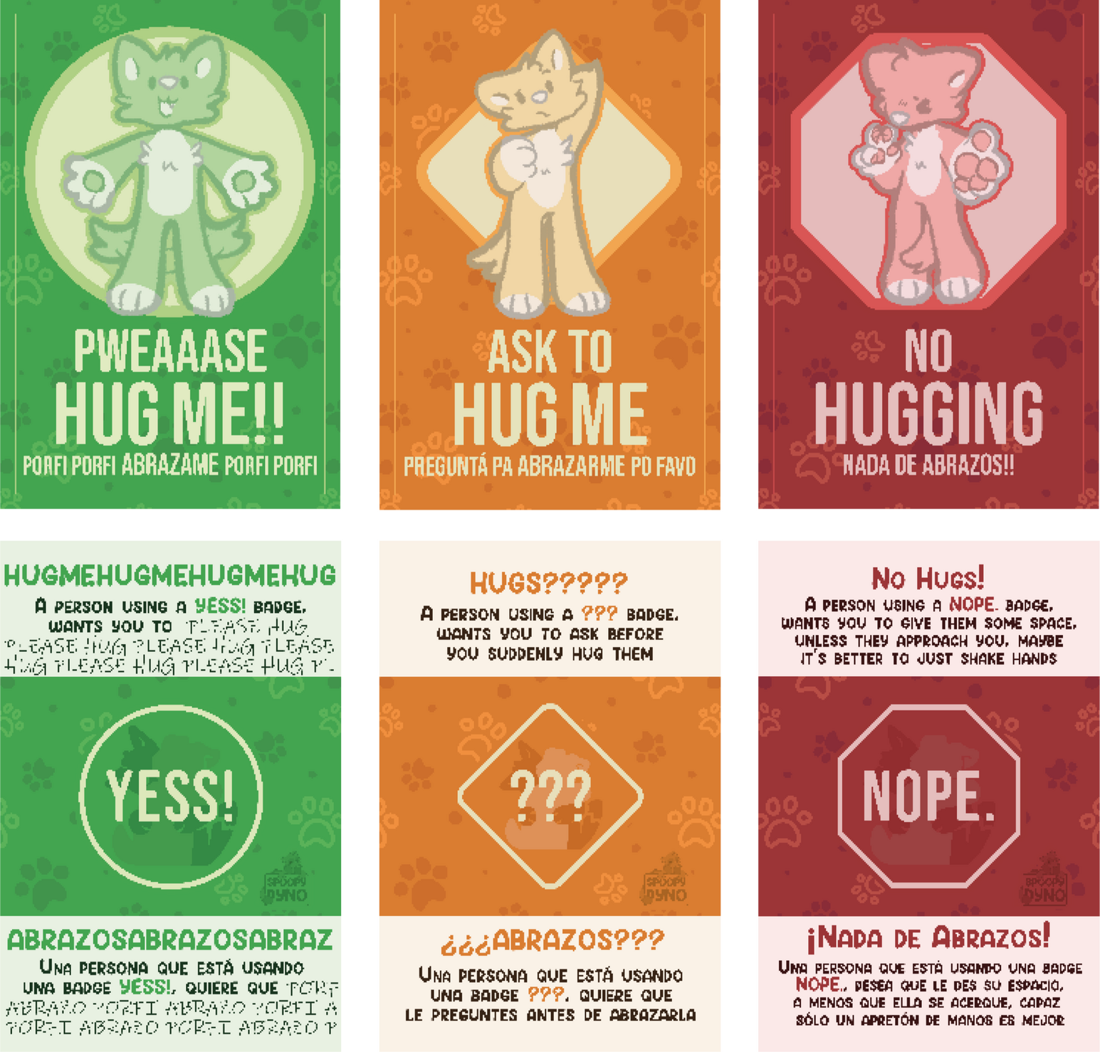 La parte delantera tiene el nombre del personaje, su especie, sus pronombres, dos banderas, dos redes sociales, y un Half o Fullbody.